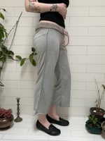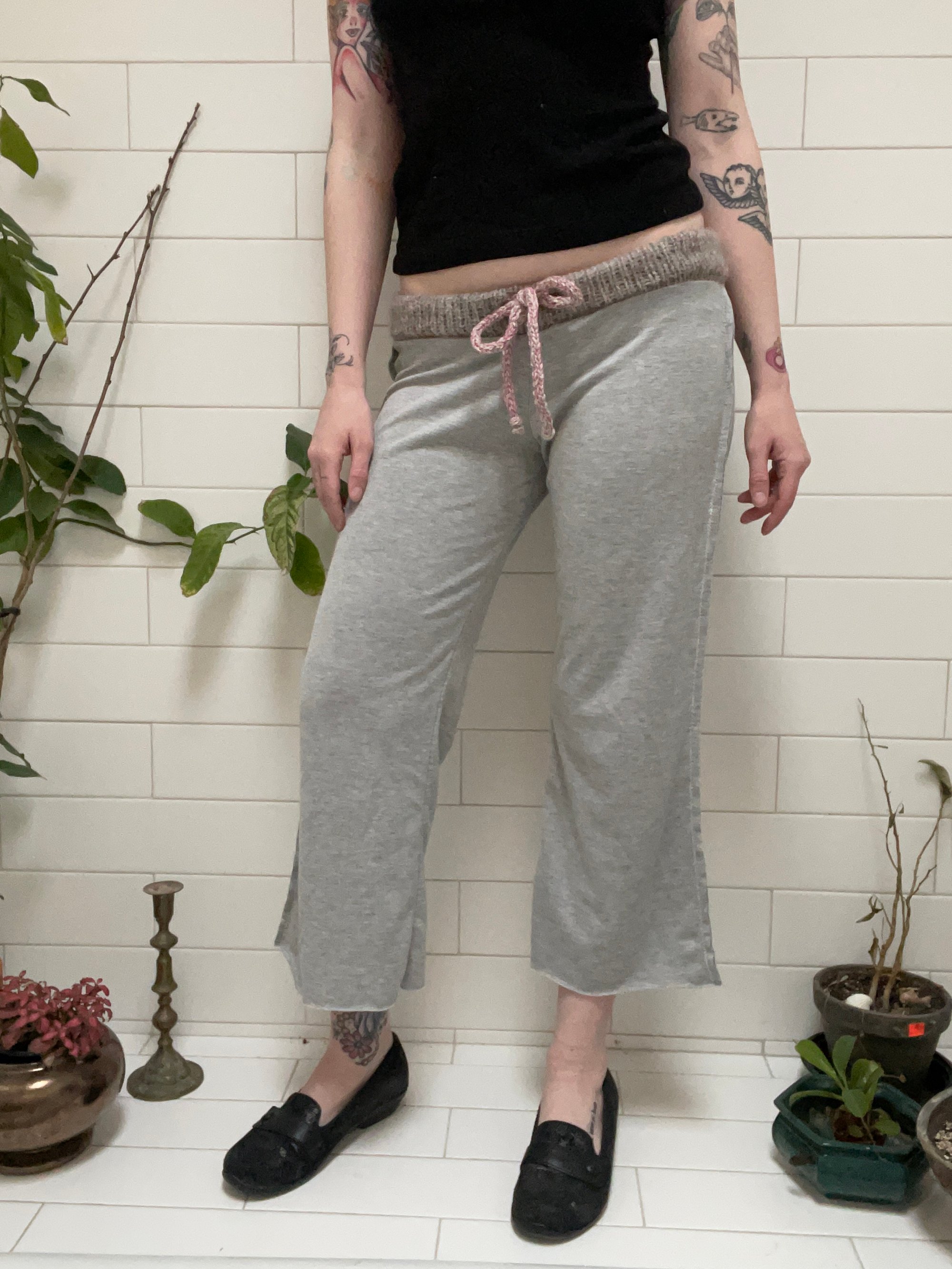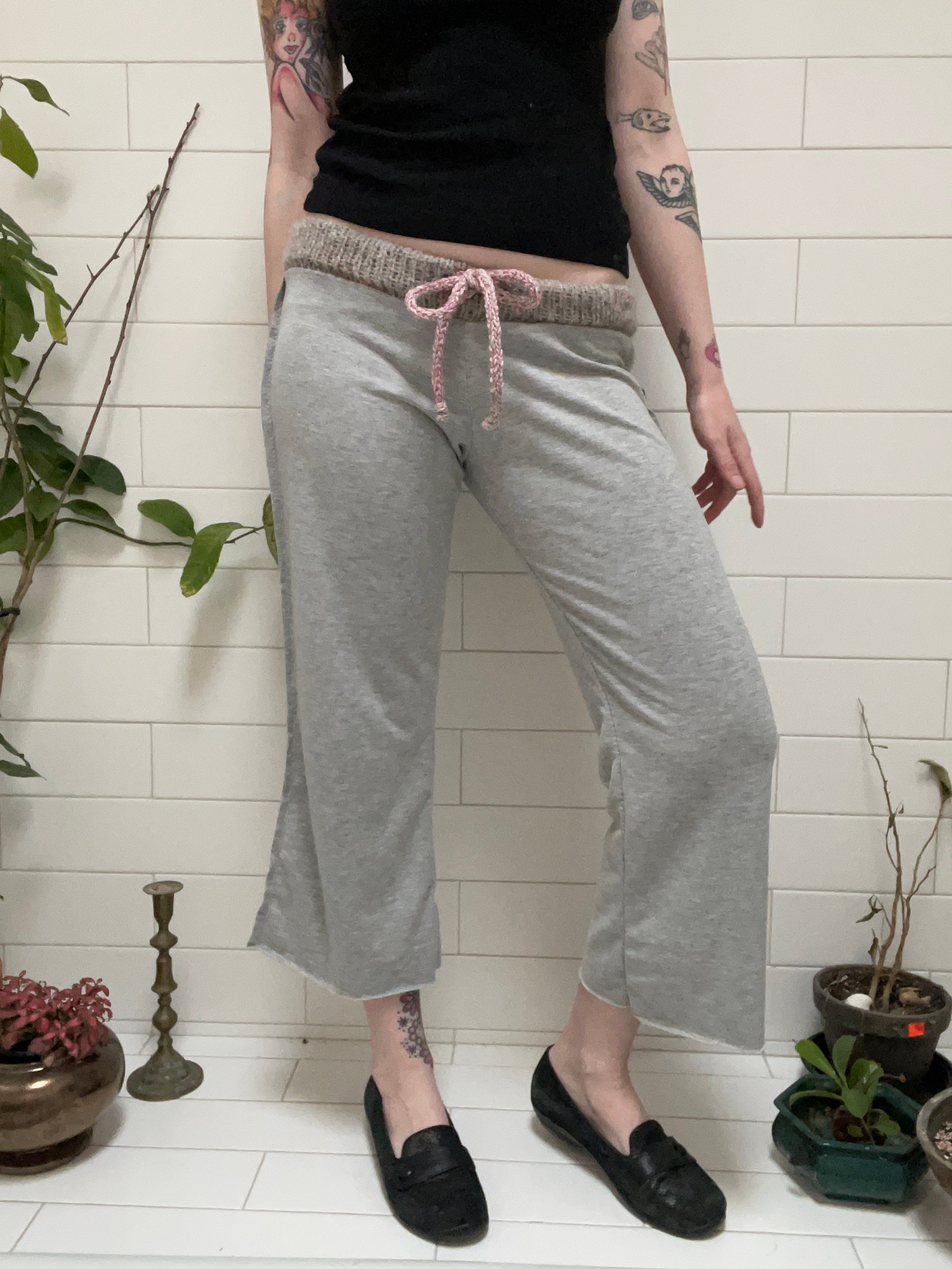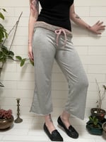 stretchy knit grey cropped pants with grey multi merino wool waist band and drawstring